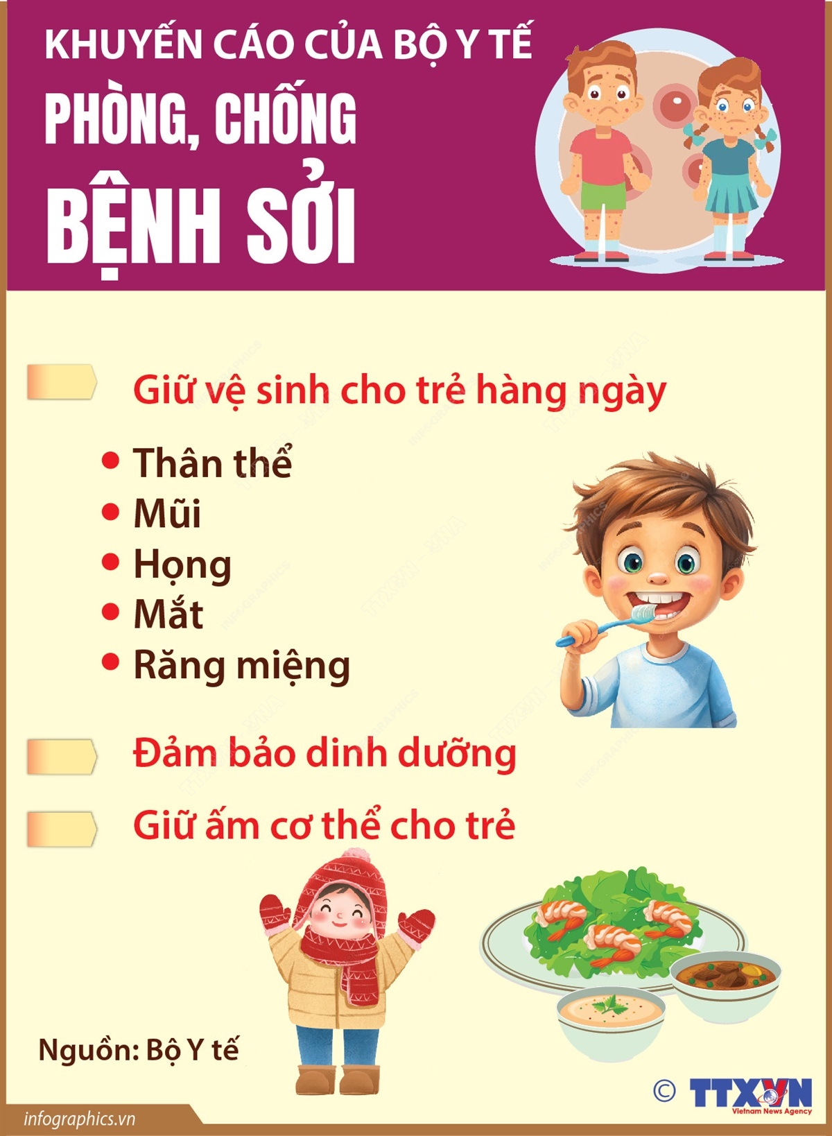 Để phòng chống bệnh sởi cho trẻ, cần lưu ý: Giữ vệ sinh thân thể, mũi, họng, mắt, răng miệng cho trẻ hàng ngày. Đảm bảo dinh dưỡng, giữ ấm cơ thể cho trẻ.