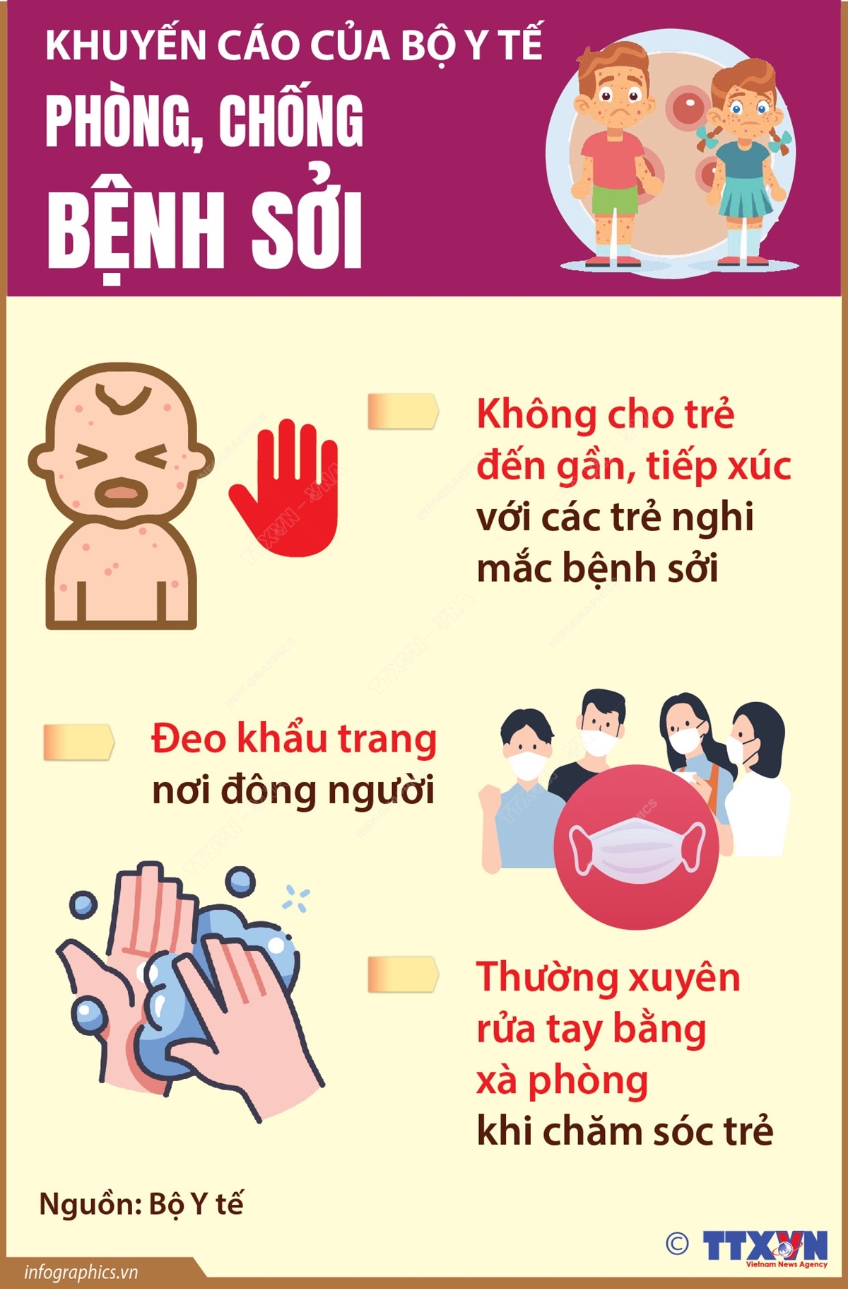 Không cho trẻ đến gần, tiếp xúc với các trẻ nghi mắc bệnh sởi. Thường xuyên rửa tay bằng xà phòng khi chăm sóc trẻ. Đeo khẩu trang nơi đông người. Đó là những cách phòng chống bệnh sởi theo khuyến cáo của Bộ Y tế.