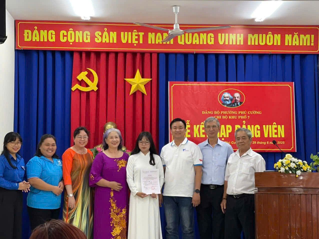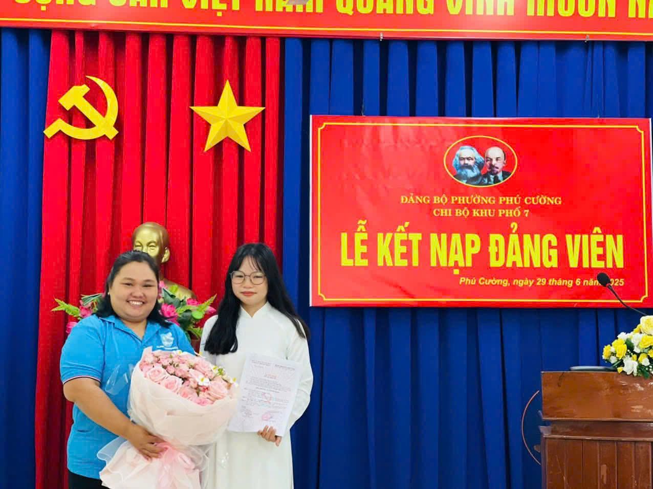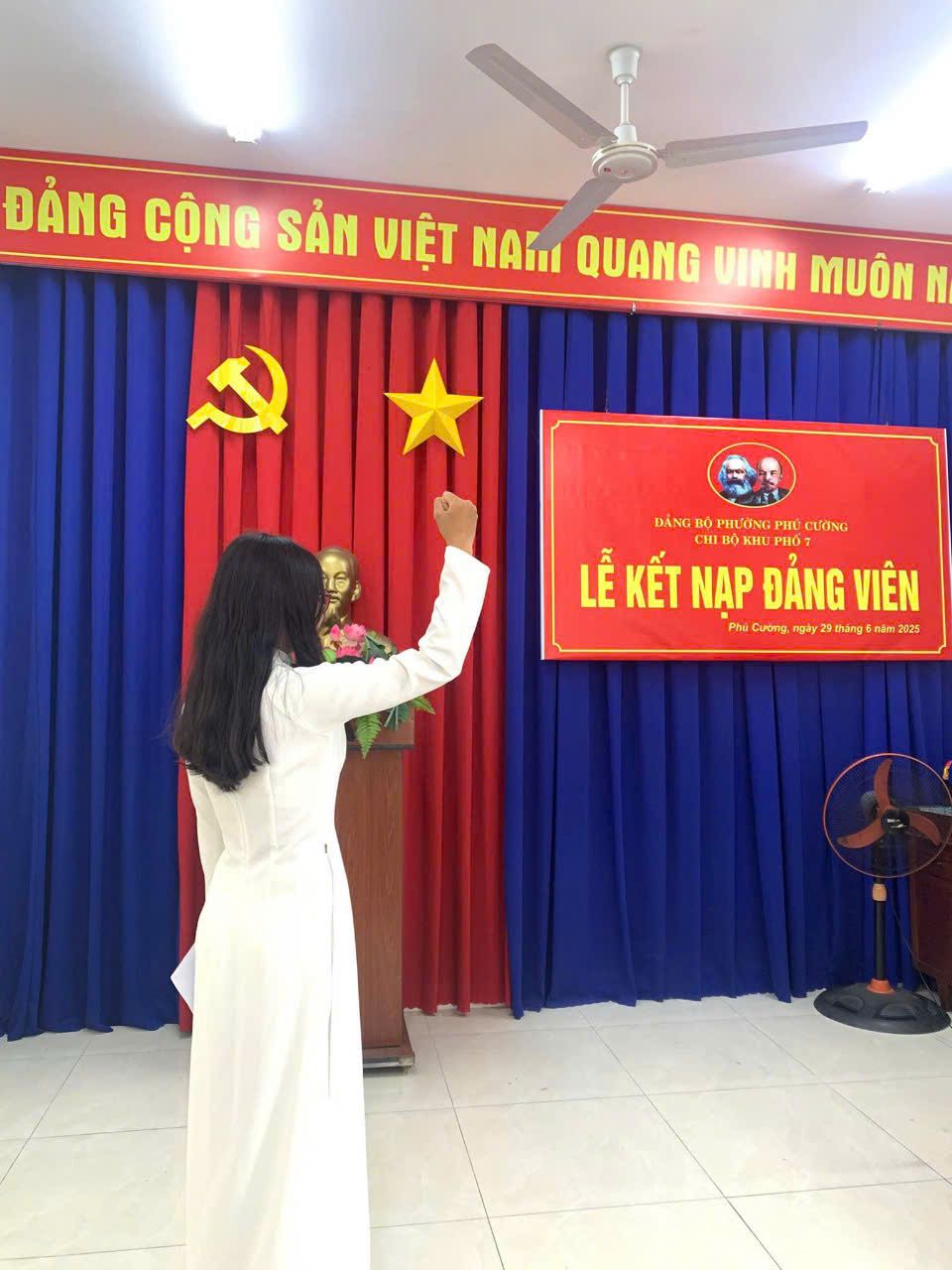 Thực hiện Nghị quyết phát triển đảng viên năm 2025, sáng ngày 29/6/2025 tại Văn phòng Ban điều hành khu phố 7, Chi bộ khu phố 7, phường Phú Cường đã long trọng tổ chức lễ kết nạp đảng viên mới cho quần chúng Lê Thị Ngọc Thảo – người đã có quá trình rèn luyện, phấn đấu và được chi bộ theo dõi, bồi dưỡng trong thời gian qua.