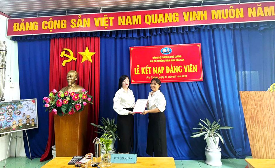 Tại buổi lễ kết nạp Đồng chí Trần Minh Châu - Bí thư chi bộ thông qua nhiệm vụ và quyền hạn của người Đảng viên. Thông qua quyết định và trao quyết định kết nạp đảng viên cho đồng chí Nguyễn Thị Hồng Nhung - Viên chức văn thư Trường Mầm Non Hoa Lan. Phân công 2 đồng chí đảng viên chính thức giúp đỡ đồng chí Nguyễn Thị Hồng Nhung trở thành Đảng viên chính thứctrong thời gian tới.