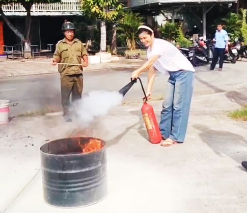 Đặc biệt, buổi tập huấn còn có phần thực hành vô cùng sinh động khi các tiểu thương được trực tiếp trải nghiệm việc sử dụng bình chữa cháy để dập tắt đám cháy giả định.