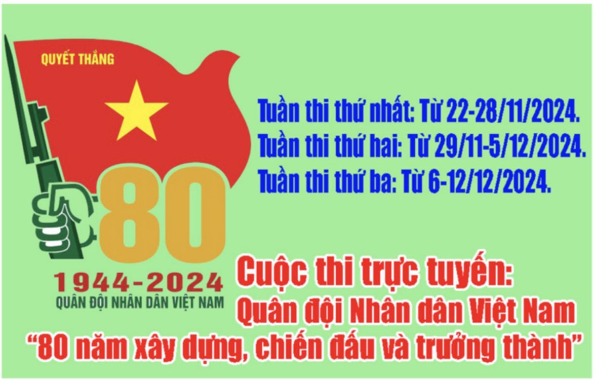 Nhân kỷ niệm 80 năm Ngày thành lập Quân đội Nhân dân Việt Nam (22/12/1944 - 22/12/2024) và 35 năm Ngày hội Quốc phòng toàn dân (22/12/1989 - 22/12/2024); nhằm góp phần tuyên truyền, giáo dục sâu rộng trong toàn Đảng, toàn dân, toàn quân về lịch sử vẻ vang 80 năm xây dựng và phát triển của Quân đội nhân dân Việt Nam; Ban Tuyên giáo Trung ương phối hợp Tổng cục Chính trị QĐND Việt Nam tổ chức Cuộc thi trực tuyến “Quân đội Nhân dân Việt Nam - 80 năm xây dựng, chiến đấu và trưởng thành” trên Trang Thông tin điện tử tổng hợp Báo cáo viên (baocaovien.vn) như sau: