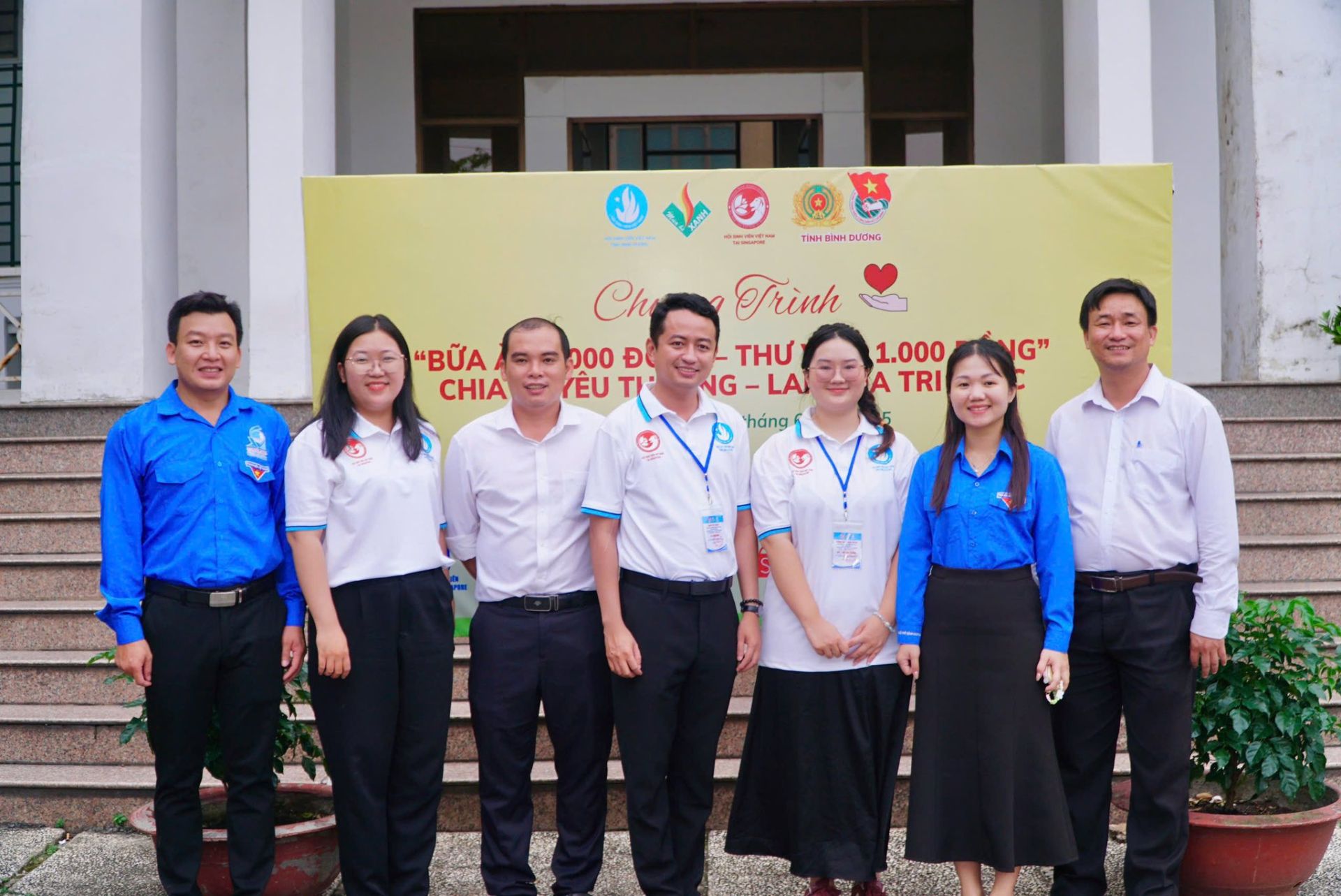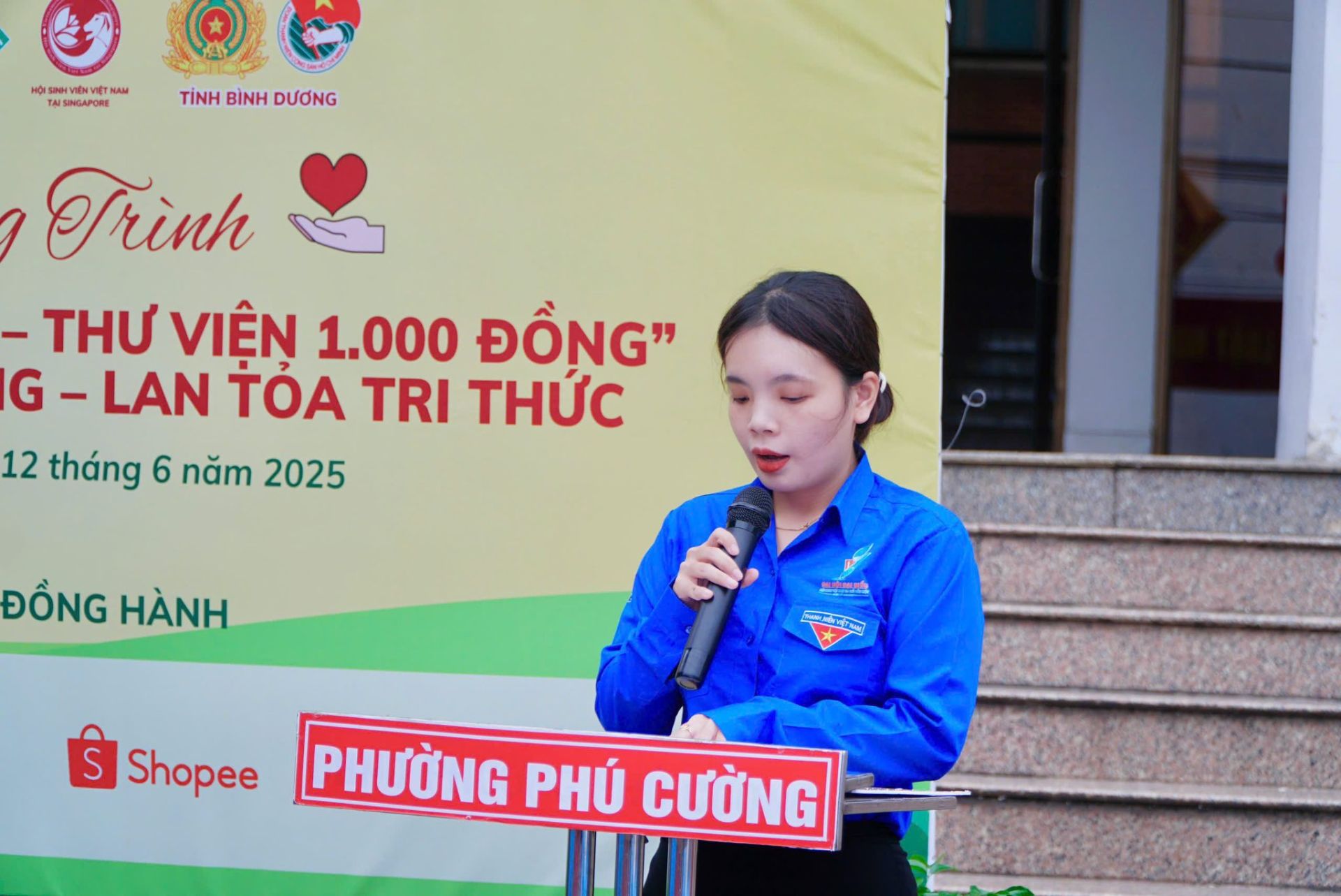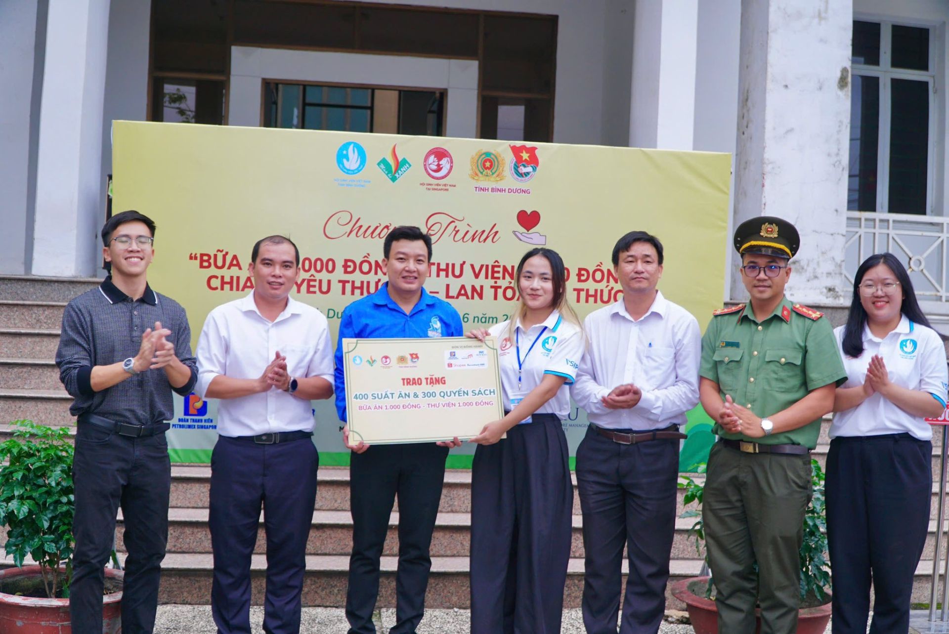 Thay mặt Thường trực Hội Sinh viên Việt Nam tỉnh Bình Dương và Hội Sinh viên Việt Nam tại Singapore trao tặng bảng tượng trưng “Bữa ăn 1.000 đồng” và “Thư viện 1.000 đồng” cho Đoàn thanh niên phường Phú Cường.