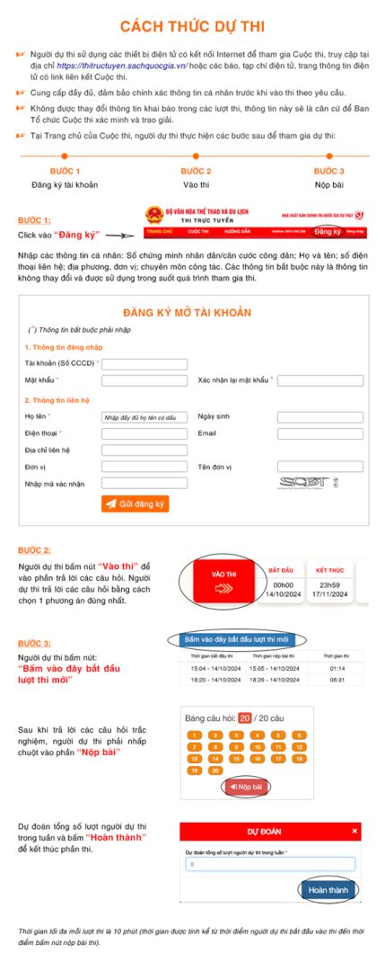 Cuộc thi này được tổ chức công khai, rộng rãi trên toàn quốc dưới hình thức thi trắc nghiệm trực tuyến trên Cổng thông tin điện tử của Bộ Văn hóa, Thể thao và Du lịch tại địa chỉ https://thitructuyen.sachquocgia.vn/ và các báo, tạp chí điện tử, trang thông tin điện tử có liên kết Cuộc thi.