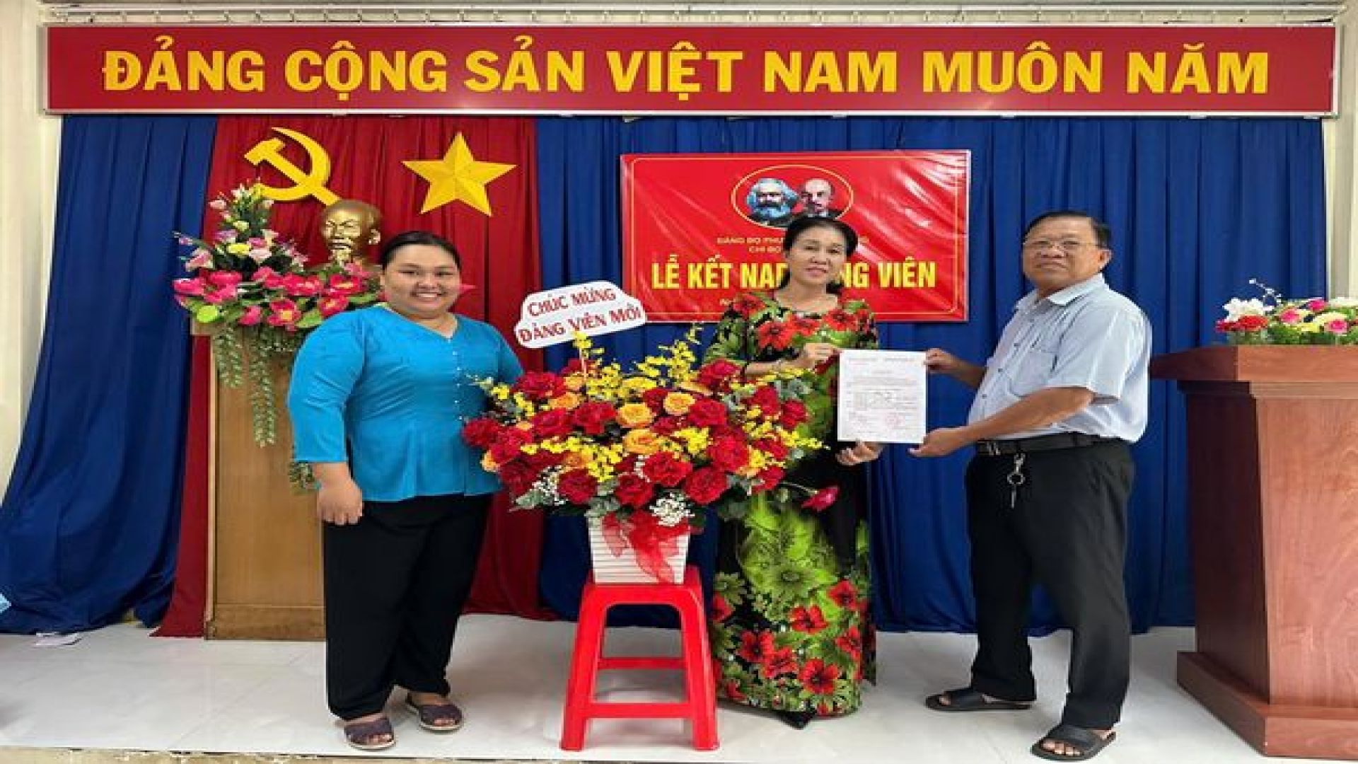 Trước cờ Đảng, cờ Tổ quốc và chân dung Chủ tịch Hồ Chí Minh, đảng viên mới Nguyễn Thị Thanh Hoàng đã đọc lời tuyên thệ và hứa sẽ tiếp tục phấn đấu để luôn xứng đáng là người đảng viên gương mẫu, đóng góp sức mình thực hiện thành công nhiệm vụ chính trị của chi bộ, của địa phương, góp phần xây dựng chi bộ ngày càng vững mạnh. Cũng tại buổi lễ, đồng chí Cao Thị Hồng Nhung - Chủ tịch Hội LHPN phường thay mặt Ban thường vụ Hội trao tặng hoa và lời chúc mừng đến đồng chí Đảng viên mới và mong rằng đồng chí tiếp tục phấn đấu, nỗ lực trong công tác chuyên môn, giữ gìn phẩm chất đạo đức, hoàn thành xuất sắc các nhiệm vụ, phong trào, các hoạt động trong công tác Hội.