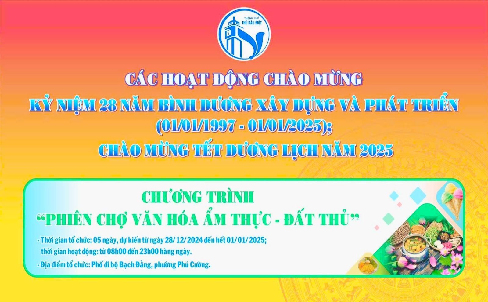 Từ ngày 28/12/2024, tại phố đi bộ Bạch Đằng, phường Phú Cường; phiên chợ Văn hóa Ẩm thực - Đất Thủ đã thu hút đông đảo người dân địa phương và du khách. Các gian hàng ẩm thực trưng bày các món ăn đặc sản, truyền thống và hiện đại, mang đậm hương vị quê hương, từ các món ăn nhẹ đến những món ăn chính.