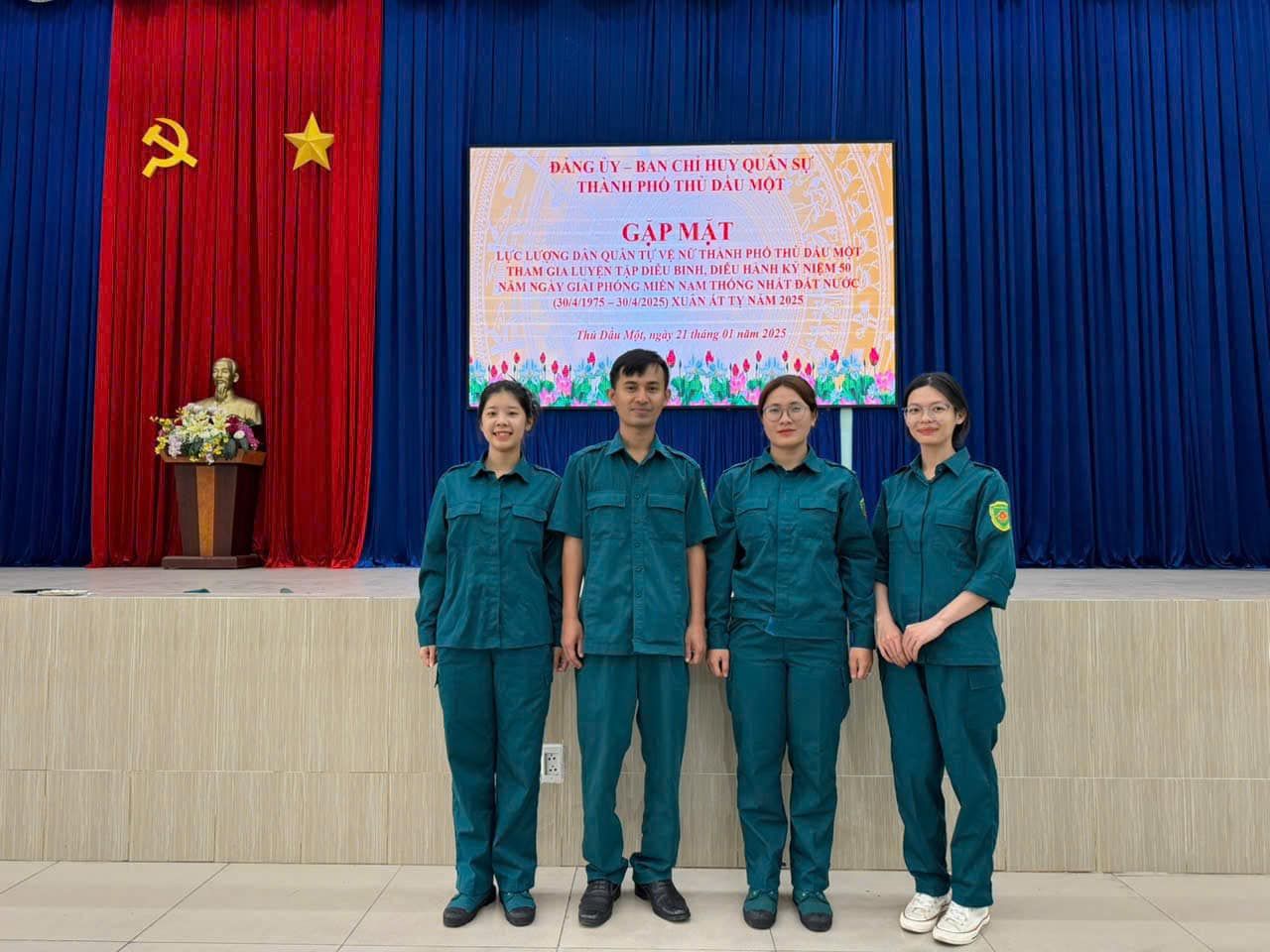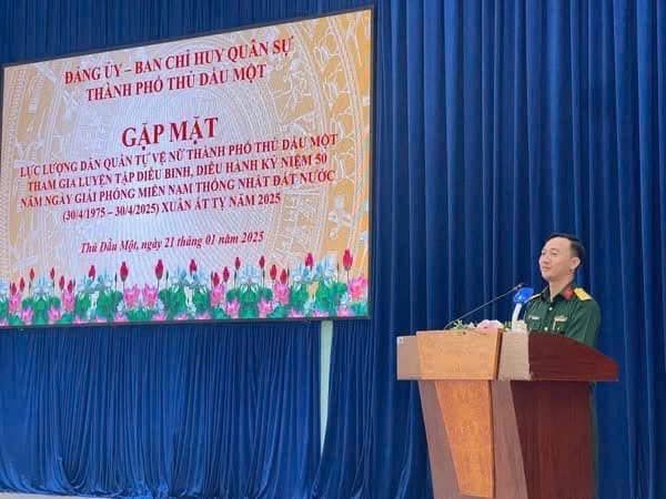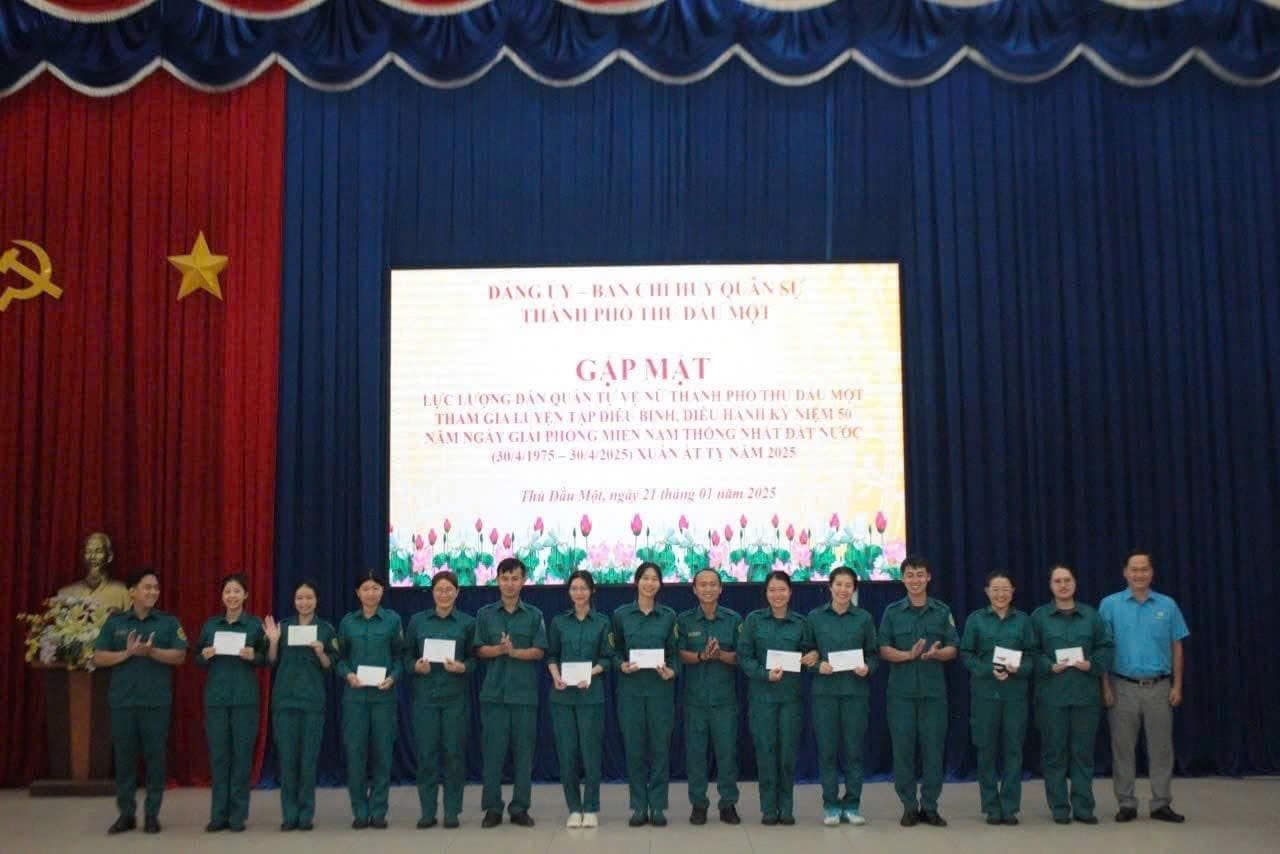 Chiều ngày 21/01/2025, tại Trung tâm Giáo dục quốc phòng tỉnh Bình Dương, Ban chỉ huy Quân sự (CHQS) phường Phú Cường cùng đoàn Đảng uỷ- Ban CHQS thành phố do đồng chí Vương Trung Tiến - Thành ủy viên, Chính trị viên/Ban CHQS thành phố làm trưởng đoàn đã đến thăm, động viên và tặng quà các nữ dân quân tự vệ (DQTV) đang luyện tập tham gia diễu binh, diễu hành dịp Lễ kỷ niệm 50 năm Ngày giải phóng miền Nam, thống nhất đất nước (30/4/1975 - 30/4/2025).