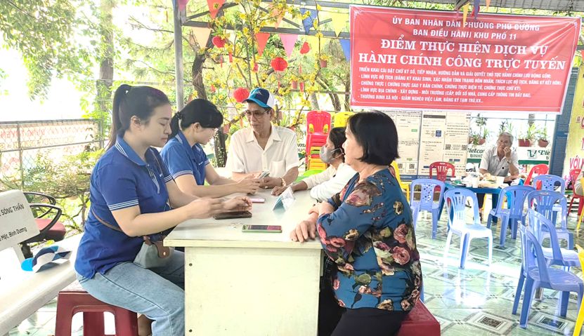 Tại đây, tất cả người dân đã được Bộ phận “1 cửa” phường Phú Cường và Tổ Công nghệ số cộng đồng khu phố 11 phối hợp cùng đơn vị viễn thông VNPT và Viettel Thủ Dầu Một đã tận tình hướng dẫn và hỗ trợ người dân tạo tài khoản chữ ký số; đồng thời, hướng dẫn người dân sử dụng dịch vụ công trực tuyến, khai mẫu tờ khai điện tử, ký số, nộp hồ sơ, tra cứu hồ sơ, lưu trữ hồ sơ trực tuyến và thanh toán trực tuyến thông qua Cổng dịch vụ công quốc gia, hệ thống thông tin giải quyết thủ tục hành chính tỉnh Bình Dương đối với các lĩnh vực như: lĩnh vực Hộ Tịch (đăng ký khai sinh, xác nhận tình trạng hôn nhân, trích lục hộ tịch, đăng kỷ kết hôn); lĩnh vực Chứng thực (chứng thực sao y từ bản chính, chứng thực điện tử, chứng thực chữ ký), đăng ký cư trú…