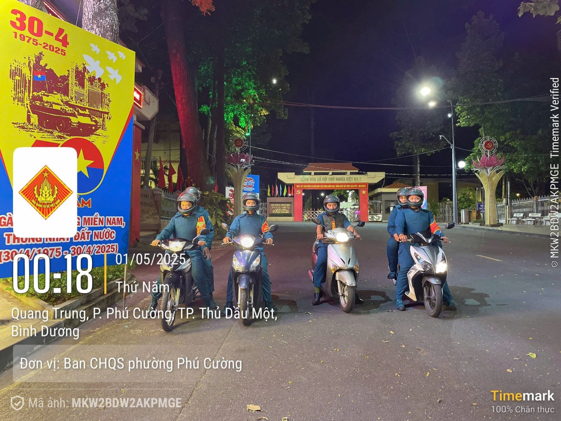 Nhằm bảo đảm an ninh trật tự, an toàn cho người dân và du khách trong dịp lễ trọng đại kỷ niệm 50 năm Ngày Giải phóng miền Nam, thống nhất đất nước (30/4/1975 - 30/4/2025). Theo đó, tối ngày 30/4/2025 Ban Chỉ huy Quân sự phường Phú Cường đã tăng cường công tác tuần tra, kiểm soát trên toàn địa bàn nhằm đảm bảo an ninh, trật tự và an toàn tuyệt đối cho nhân dân trên địa bàn trong những ngày lễ trọng đại.